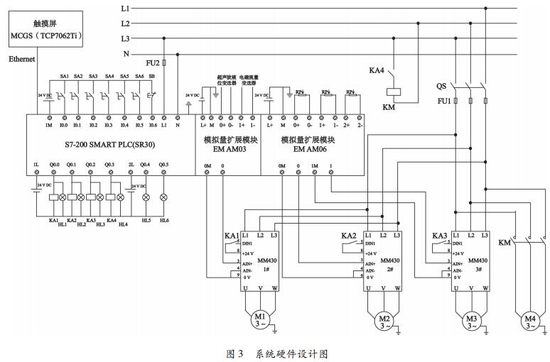 ( 1) 控制器采用 SIEMENS S7-200 SMART PLC ( SR30) ,配有 2 個模擬量擴展模塊 EM AM03 和 EM AM06,實現(xiàn)模擬量地采集以及模擬量輸出[6];